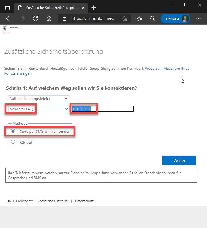 - Die Methode Authentifizierungstelefon, das Land des Providers, die Mobiltelefonnummer und die Auswahl Code per SMS an mich senden anwählen. Eingaben mit Weiter bestätigen.
