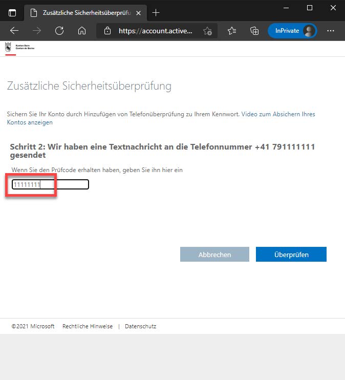 - Den per SMS erhaltenen Prüfcode im Eingabefeld eingeben und Überprüfen bestätigen.
