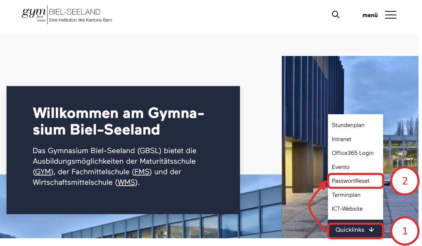 Auf 👉 gbsl.ch auf Quicklinks > Passwort Reset klicken.