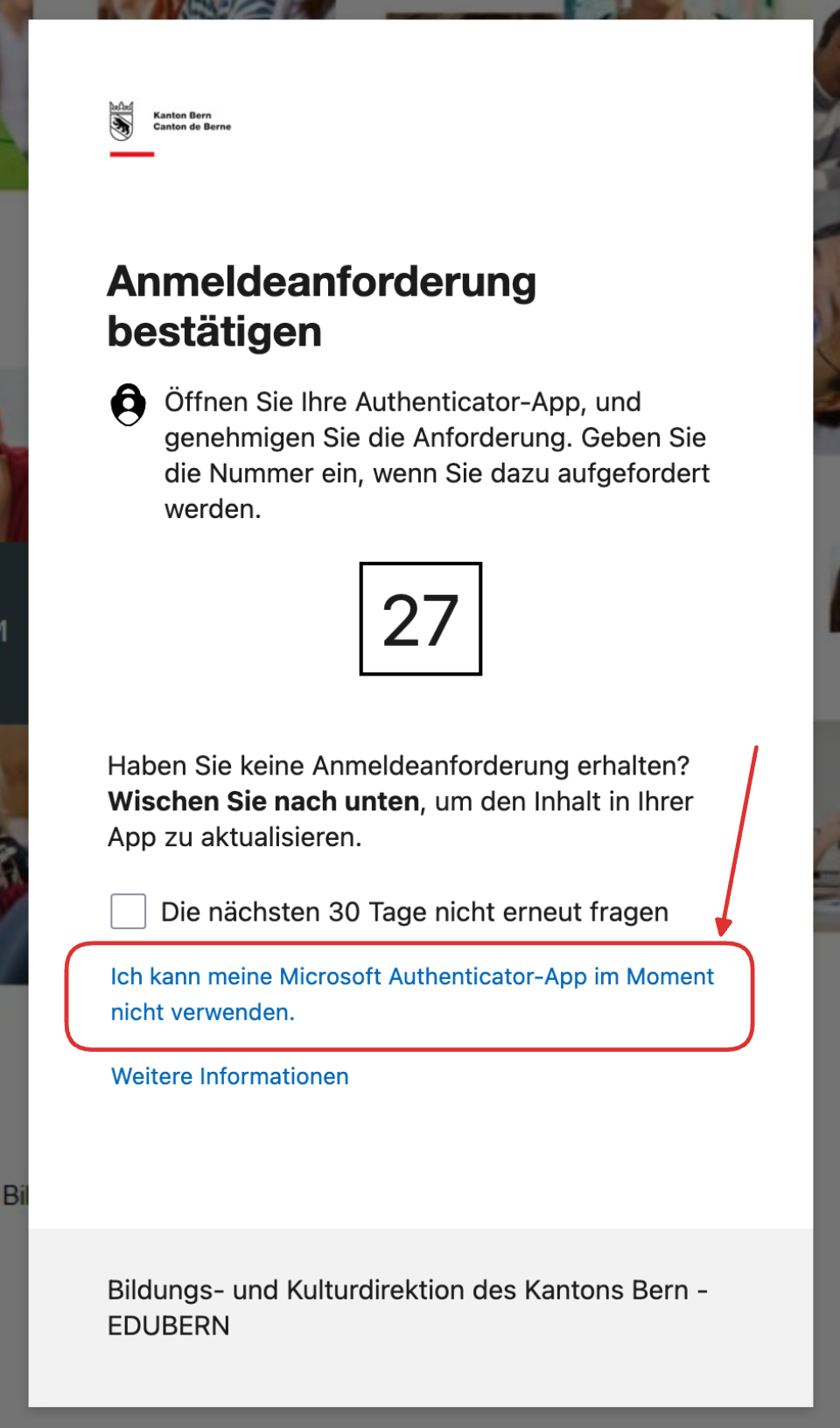 Im neuen Fenster [Anmeldemethode hinzufügen] auswählen. Methode «Microsoft Authenticator» gemäss Anweisungen auf Bildschirm einrichten. Anschliessend kann die MFA für das Login wieder wie gewohnt verwendet werden. Informationen und Anleitungen dazu sind auf der 👉 Website von EDUBERN zu finden.
