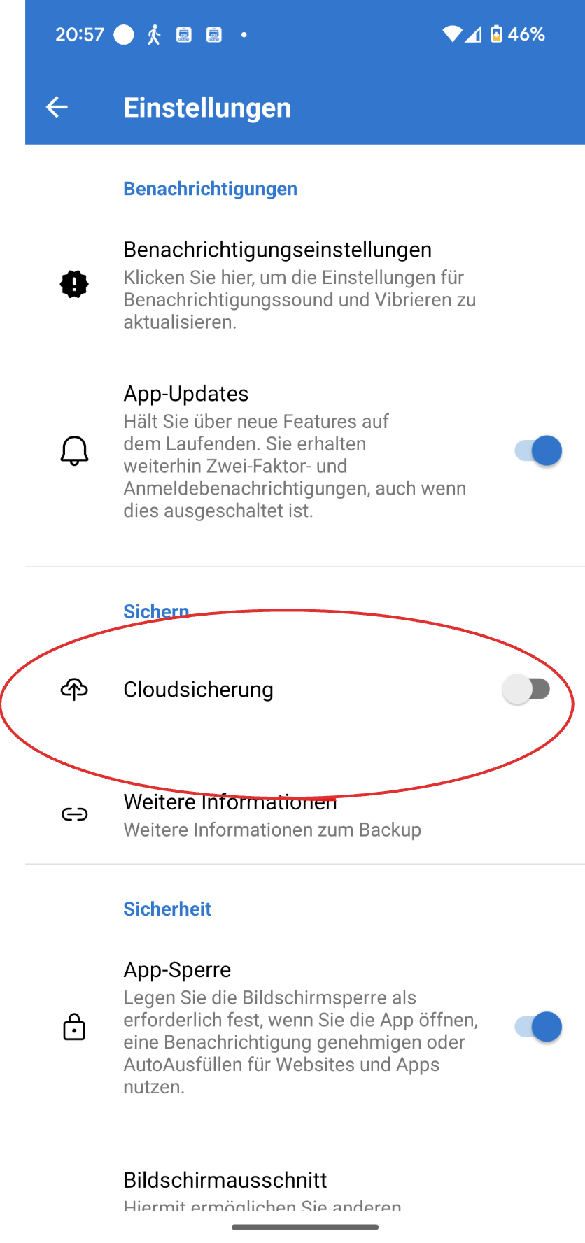 - Aktivieren Sie die Cloudsicherung, damit Ihre Authenticator-Daten in Ihrem privaten Microsoft-Konto gesichert werden.