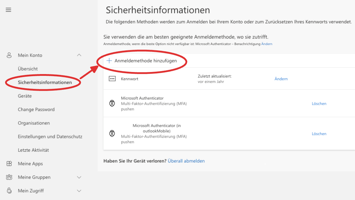 - Gehen Sie in Ihrem Konto auf Sicherheitsinformationen und anschliessend auf Methode hinzufügen.